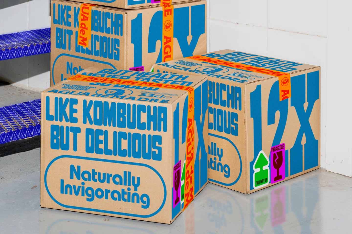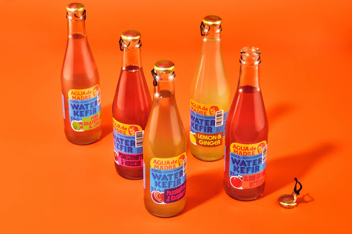 品牌升級設計主要有兩個目標。首先,我們希望讓大家了解Agua de Madre背后俏皮美學的靈感來源,即“品味與尊重Madre精神的傳達”。通過將鮮艷的色彩與懷舊字體相結合,我們能夠巧妙地暗示出飲料的活潑口感。同時,引入坦率重疊的貼紙設計,借鑒兒童貼紙書的形式(以及人們在使用貼紙書時所獲得的快樂),進一步強化了品牌的趣味性。雖然水開菲爾的含糖量低且味道細膩,但它本身是一種具有蘇打水風格的飲品。為了突出這一點,設計師特意采用了熟悉而俏皮的字體以及明亮、充滿活力的色彩,使Agua de Madre在眾多酒精和康普茶類競爭產品中脫穎而出,彰顯其獨特的品牌魅力。
