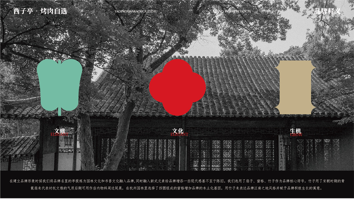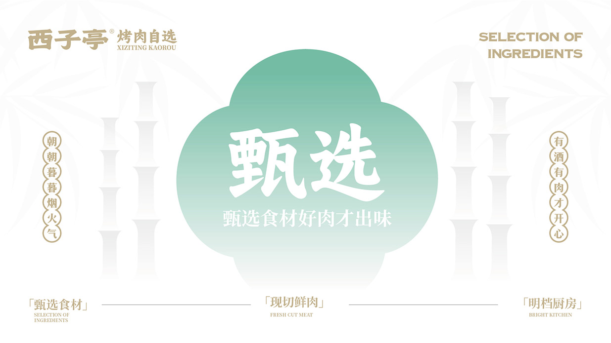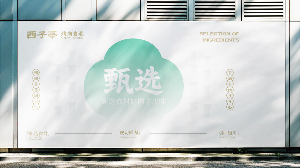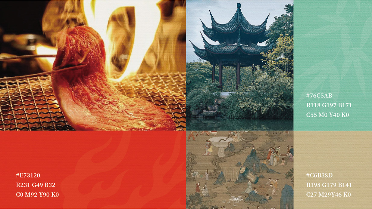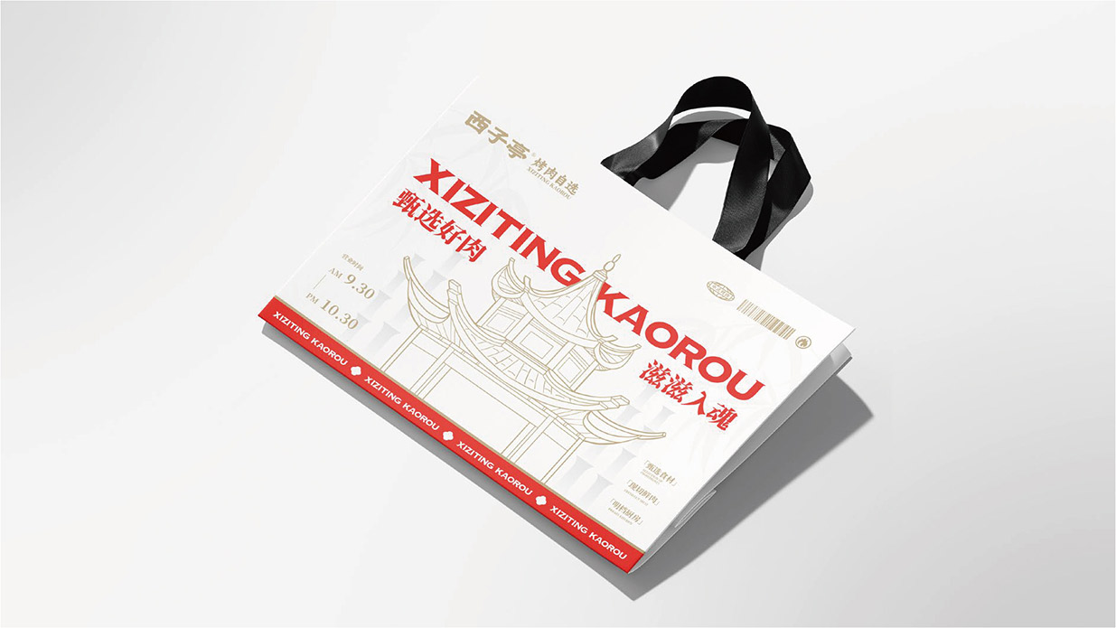 Introduction:西子亭炭火烤肉,秉承傳統炭火烤炙工藝,以老底子老味道為魂,讓美食回歸本真。品牌形象設計采用新中式風格品牌運用炭火紅與竹青,營造出溫馨、舒適的用餐氛圍。同時,借助黑色的點綴,提升品牌的高貴與典雅。